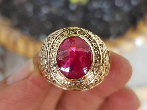 nhẫn mỹ vàng 10k hột đỏNhẫn mỹ University năm 1948Trên cùng là hột màu tím hoa violet với bề mặt mài đa giác đáy rỗng tạo độ thông thoáng , bao quanh hột là câu...