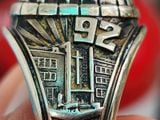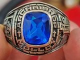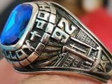 nhẫn mỹ xưa bá cấm vàng năm 1992- Trên cùng là hột đá xanh màu Sapphire với bề mặt và đáy mài đa giác lấp lánh rất sáng tài, bao quanh hột là tên trường Archbishop Molloy High School...