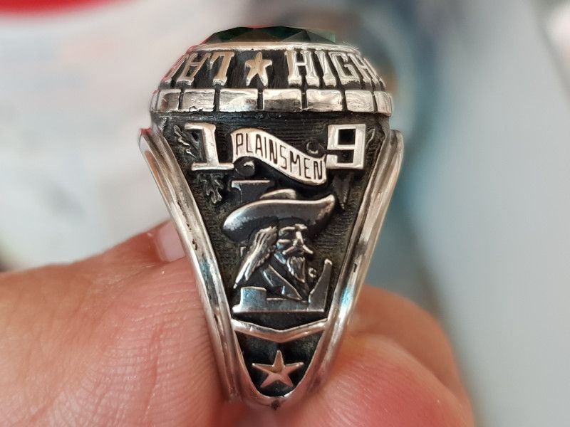 Trên cùng là hột màu xanh lá Emerral với bề mặt và đáy mài đa giác lấp lánh, đáy cùm tia cực hiếm gặp, bao quanh hột là tên trường Laramie High School