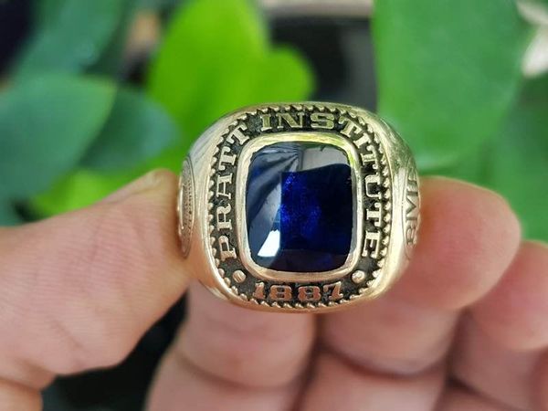 nhẫn vàng 10k hiếm Trên cùng là hột màu xanh sapphire có bề mặt trơn bóng , bao quanh là dòng chữ Pratt Institute ( Học viện Pratt nổi tiếng) cùng năm thành lập 1887-...