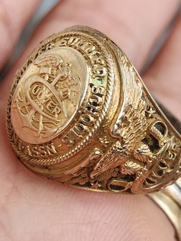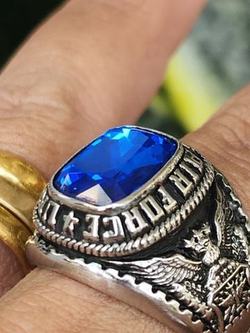 bán nhẫn mỹ hợp kim Nhẫn mỹ High School năm 1994Trên cùng là hột màu xanh biển có bề mặt mài đa giác đáy tia có khắc mặt chú gấu . bao quanh hột là tên...
