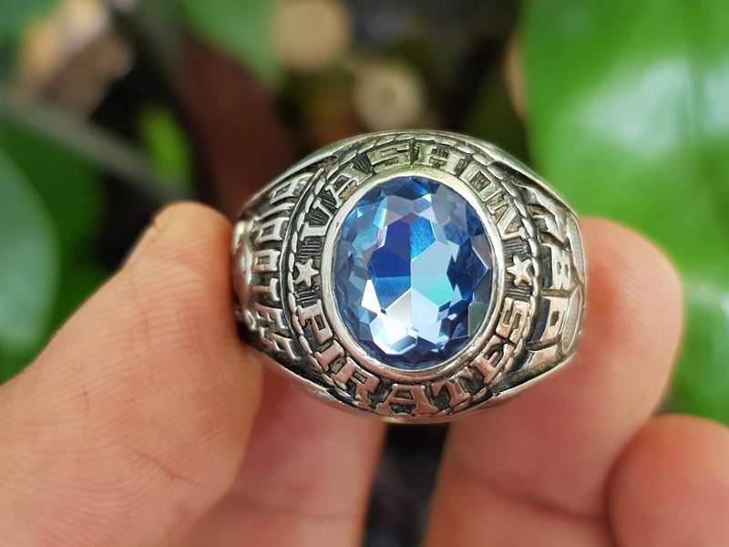 bán nhẫn mỹ jostens năm 1984Trên cùng là hột màu xanh aquamarine với bề mặt và đáy mài đa giác trong suốt lấp lánh , bao quanh hột là tên trường Vashon Pirates High School-...