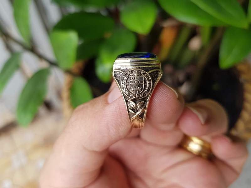 - Bên hông phải nhẫn khắc họa tiết hoa lá cùng logo có khắc năm tốt nghiệp 46 ( 1946) và dòng chữ La-Tinh nhỏ nhưng vô cùng sắc nét:"melior sapienta quam viris" tạm dịch là Nam giới có cách suy nghĩ khôn ngoan hơn .