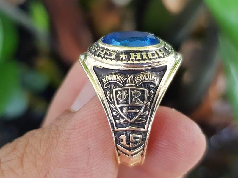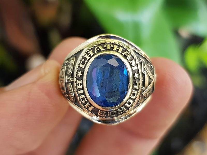 giá nhẫn mỹ vàng 10kTrên cùng là hột màu xanh aquamarine có bề mặt và đáy mài đa giác lấp lánh. Hột đáy 2DA rất hiếm gặp, bao quanh hột là tên trường Chatham High...
