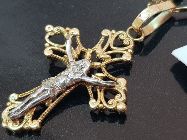 - mặt trước thánh giá đúc hình ảnh chúa Giesu vàng trắng tuyệt mỹ trên cây thánh giá cổ hoa văn, mặt sau cẩn hoa văn nhiều mặt. Dây chuyền mắt liền vàng cổ tam khí 3 màu Phúc - Lộc - Thọ (loại vàng xưa này khá hiếm, đổi nhiều màu khác nhau tùy theo cường độ ánh sáng xung quanh).