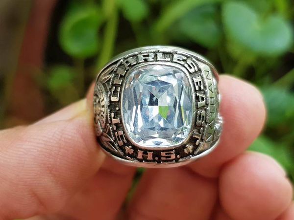 Trên cùng là hột đá màu trắng tinh khôi có bề mặt mài đa giác đáy tráng thủy lấp lánh; bao quanh hột là tên trường ST. Charles East High School