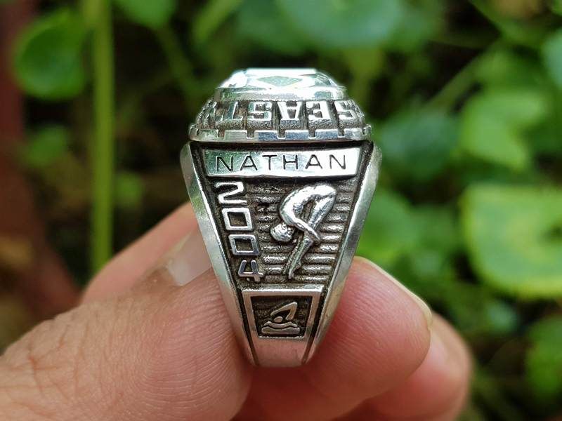 - Bên hông phải nhẫn khắc họa hình ảnh vận động viên bơi lội đang trong tư thế chuẩn bị , bên trên có khắc tên chủ cũ Nathan cùng năm tốt nghiệp 2004