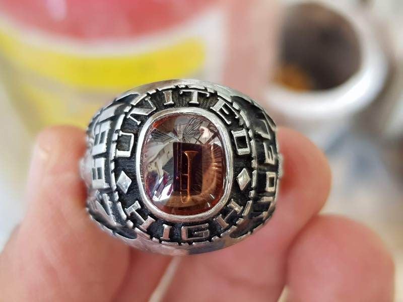 Trên cùng là hột màu vàng đất có bề mặt trơn bóng đáy tia có khắc hình ảnh kèn saxophone độc lạ, bao quanh hột là tên trường United High School