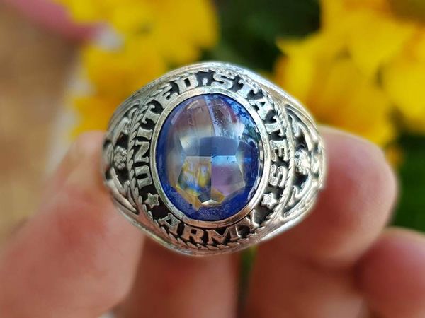 Trên cùng là hột xanh biển màu Sapphire cực đẹp ko hề bị trày xước, mặt láng đáy giác sáng tài, bao quanh bởi dòng chữ United States Army ( Lính Bộ Binh Hoa Kỳ ).