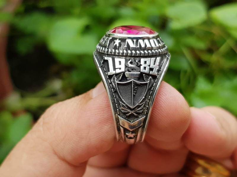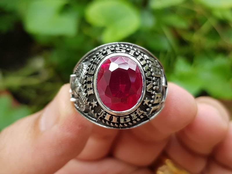 nhẫn hợp kim mỹ Trên cùng là hột màu đỏ ruby với bề mặt và đáy mài đa giác lấp lánh, bao quanh là tên trường Hightstown Highshool- Bên hông phải nhẫn khắc năm 1984...