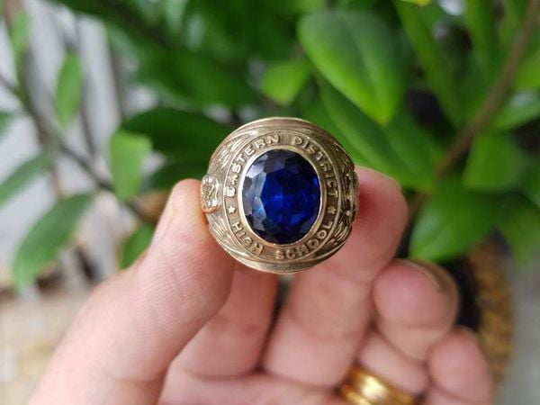 Nhẫn Mỹ 10K Giá Bao NhiêuNhẫn mỹ vàng 10k năm 1960Trên cùng là hột màu xanh dương đậm với bề mặt mài đa giác lấp lánh, bao quanh hột là tên trường Eastern District High...