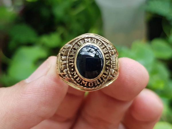 nhẫn mỹ 10k gold của hãng jostensTrên cùng là hột đá đen blackoxy với bề mặt trơn bóng, bao quanh hột là tên trường James Madison Memorial High School- Bên hông phải nhẫn là hình...