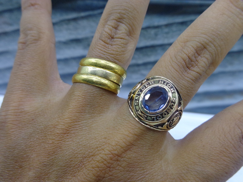 Nhẫn Mỹ 10K Năm 1966Trên cùng là hột trắng khói Taurin hiếm gặp với bề mặt và đáy mài đa giác. Bao quanh hột là tên trường Snyder High School.- Hai mặt hông được khắc...