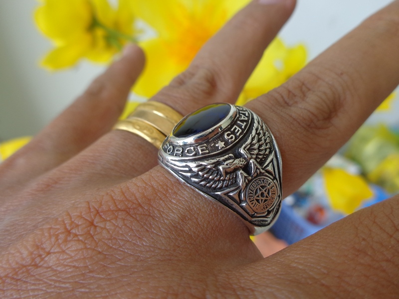 Nhẫn Mỹ Air Force Sterling– Trên cùng là hột màu xanh đen với bề mặt bóng láng– Bao quanh hột là dòng chữ United States Air Force– Hai bên hông là hình ảnh đại bàng...