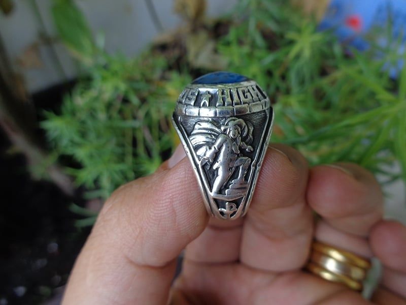 Trên cùng là hột màu Sapphire xanh biển trơn bóng phản quang sắc 7 màu rất lạ, bao quanh bởi tên trường South High School.
