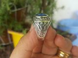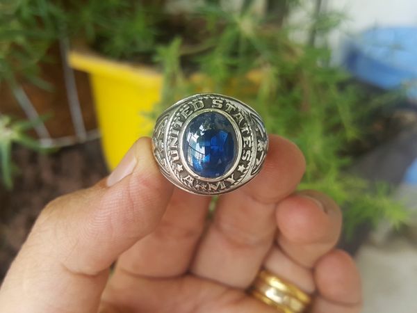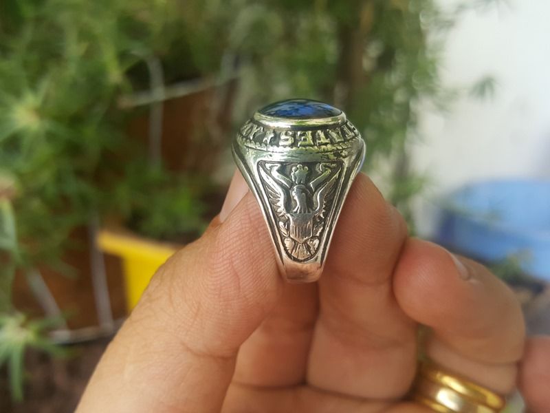 Nhẫn Mỹ Bạc Quân Đội Xưa Sterling –Trên cùng là Hột đá màu xanh dương với bề mặt láng cực đẹp đáy mài đa giác bao quanh bởi dòng chữ United Stater Army– Hai bên...