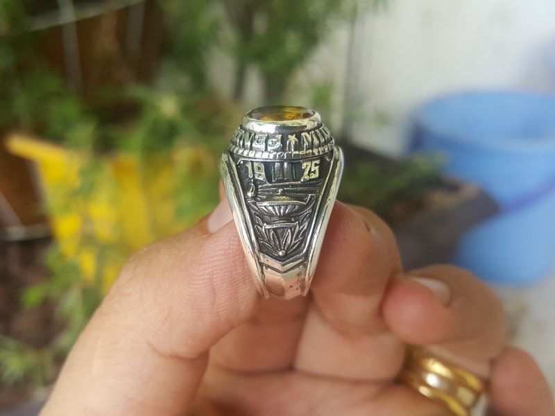 Nhẫn Mỹ Bạc Sterling 1975Trên cùng là hột màu vàng nghệ với bề mặt và đáy mài đa giác đẹp long lanh, bao quanh bởi tên trường Pendleton Middle school- Bên hông phải khắc hình...