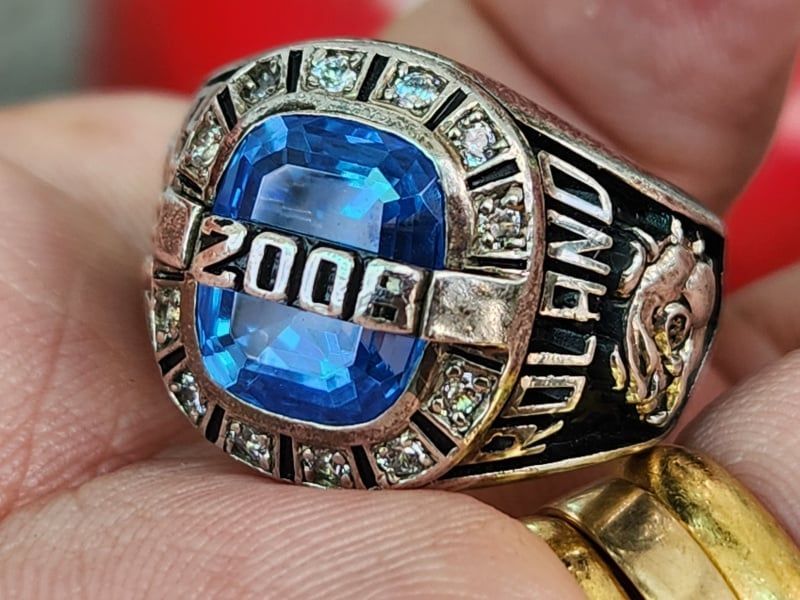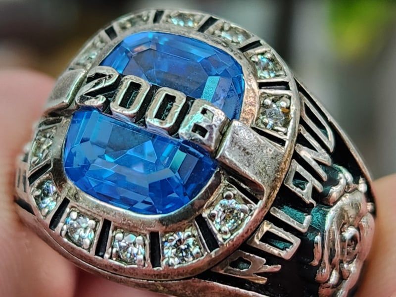 Trên cùng là mặt nhẫn phrom lớn hoành tráng , chính giữa có gắn hột xanh màu Sapphire mài đa giác đáy tráng thủy lấp lánh và đúc nổi năm tốt nghiệp 2008. Bao quanh hột được cẩn viền full 12 viên xoàn CZ 2ly2 cực kỳ sang trọng tượng trưng cho 12 cung hoàng đạo. Nhẫn tuyệt hợp cho các bác mệnh Kim hoặc Thủy.