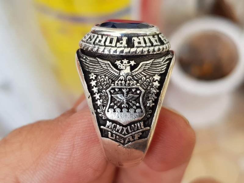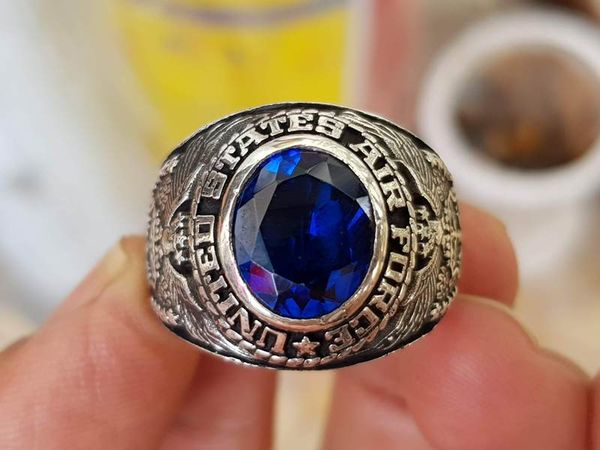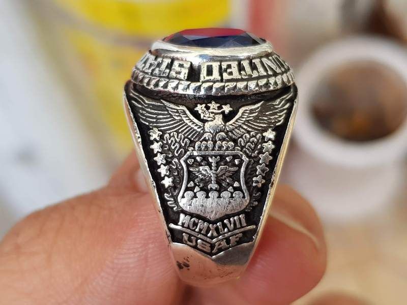 nhẫn mỹ bạc xưa lính không quân airforceTrên cùng là hột xanh biển màu Sapphire với bề mặt và đáy mài đa giác long lanh , Bao quanh hột là dòng chữ United States Air...
