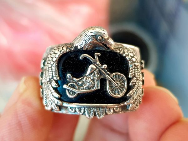 - Nhẫn bản lớn lên tay thật hoành tráng với trên cùng là hột đá đen chính giữa có gắn hình ảnh 1 chiếc Moto harley dividson đẹp tuyệt vời. Bao trùm xung quanh là hình ảnh đại vàng đẹp từng cọng lông vũ,