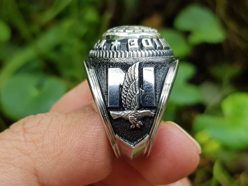 Nhẫn hợp kim đúc nguyên khối , mặt nhẫn là những đường khắc cách điệu tạo kiểu độc lạ , chính giữa có gắn hột màu ruby tạo điểm nhấn , bao quanh hột là dòng chữ Nationwide D.S.A ( công ty bảo hiểm lớn nhất nước Mỹ )