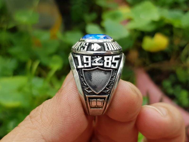 nhẫn mỹ hợp kim hcmNhẫn mỹ high school năm 1985Trên cùng là hột màu xanh biển có bề mặt và đáy mài đa giác lấp lánh, bao quanh hột là tên trường Westwood High School...