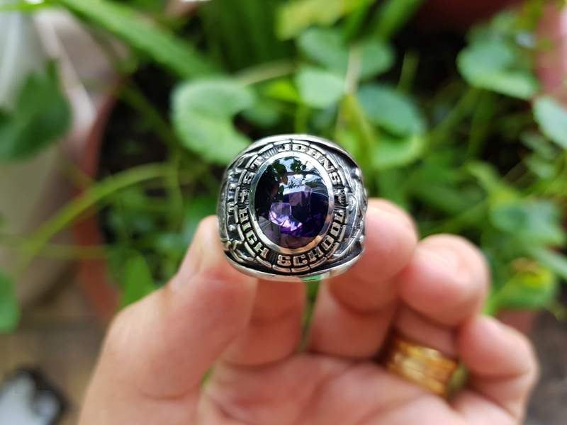 Nhẫn Mỹ Hợp Kim Herff JonesTrên cùng là hột màu tím thạch anh đẹp lung linh với bề mặt trơn bóng đáy mài đa giác, bao quanh bởi tên trường ST. Johns High School-Bên hông...