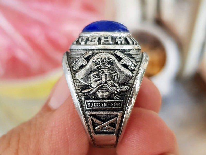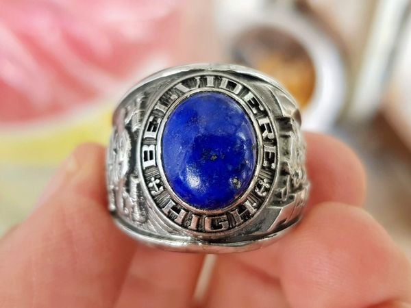 Trên cùng là hột đá màu xanh biển tròn nổi với những lấm tấm quặng vân vàng tự nhiên độc đáo. Bao quanh hột là tên trường Belvidere High School