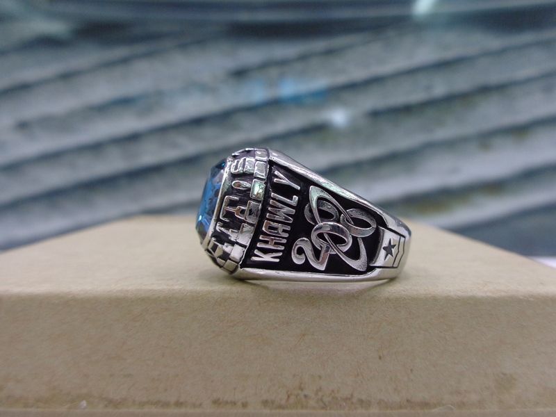 Nhẫn Mỹ Hợp Kim Josten LTM- Trên cùng là hột màu xanh khói mặt và đáy hột vát cạnh sáng lấp lánh , bao quanh hột là tên trường Ais Kuwait high school.- Bên hông...