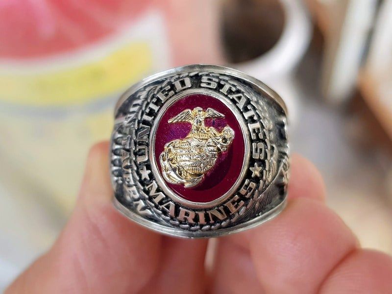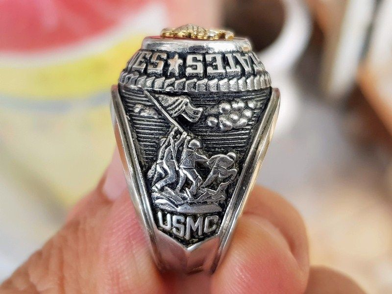 Trên cùng là hột màu đỏ Ruby láng đẹp có gắn logo của quân đoàn Thủy Quân Lục Chiến bằng vàng 10k , bao quanh hột là dòng chữ United States Marines