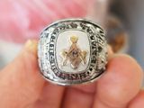 nhẫn mỹ hợp kim logo vàng masonic- Trên cùng là mặt kim loại sáng bóng xước nhuyễn có gắn Logo Hội Tam Điểm Masonic thần bí bằng vàng 10k. bao quanh hột là tên trường...