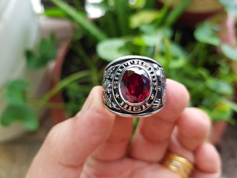 Nhẫn Mỹ Hợp Kim Năm 1980Trên cùng là hột màu đỏ ruby boodo đậm với bề mặt mài đa giác sáng lấp lánh, bao quanh hột là tên trường South Side High School.- Bên hông...