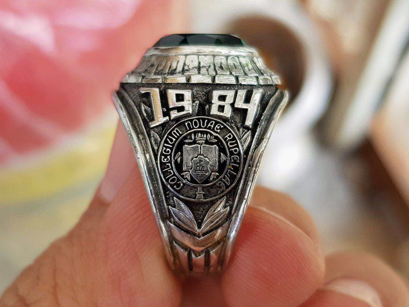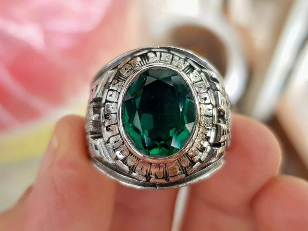 nhẫn mỹ hợp kim nam college Trên cùng là hột màu xanh lá với bề mặt và đáy mài đa giác lấp lánh , bao quanh hột là dòng chữ College Of New Rochelle CNR -...