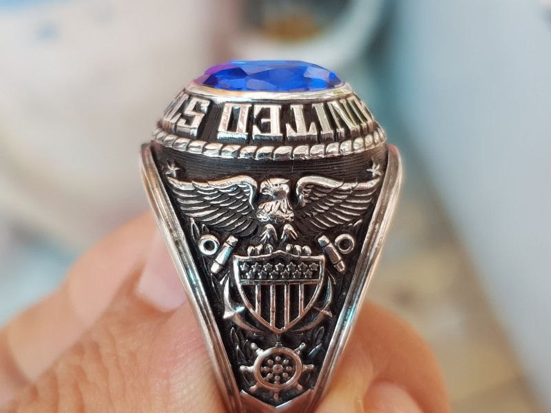-Bên hông phải nhẫn là hình ảnh logo đặc trưng của hải quân Hoa Kỳ. tay lái tài cực lớn với 2 sao và những chữ khắc siêu nhỏ siêu nét hiếm thấy, bao quanh là dùng chữ siêu nhỏ nhưng siêu siêu nét Huấn Luyện Đào Tạo Hải Quân Hoa Kỳ Orlando Plorida.