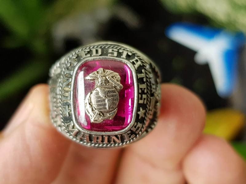 nhẫn mỹ hợp kim quân độiTrên cùng là hột màu đỏ Ruby láng đẹp có gắn logo của quân đoàn Thủy Quân Lục Chiến nổi bật, bao quanh hột là dòng chữ United States Marines–...