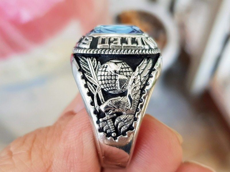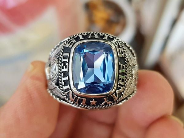 nhẫn mỹ hợp kim quân đội jostenTrên cùng là hột xanh aquamarine với bề mặt và đáy mài đa giác long lanh. Bao quanh hột là dòng chữ United States Army ( Lục Quân Hoa...