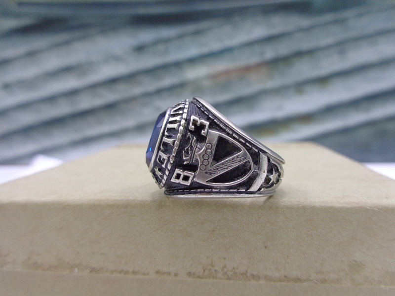 Nhẫn Mỹ Hợp Kim Quý Argentus– Trên cùng là hột xanh biển màu Sapphire với bề mặt và đáy mài đa giác long lanh, Bao quanh hột là tên trường Sheybyville High School.– Bên hông...