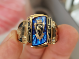 nhẫn mỹ hợp kim xi vàng Jostens YLTMtrên cùng là hột xanh biển đáy tia độc đáo, chính giữa hột có gắn Logo trường chữ S cực đẹp. hai bên thành nhẫn khắc năm tốt...