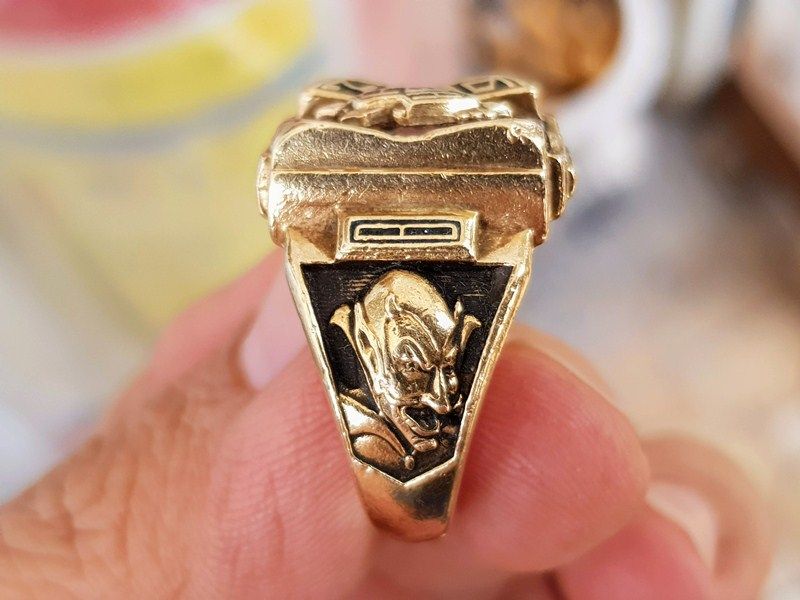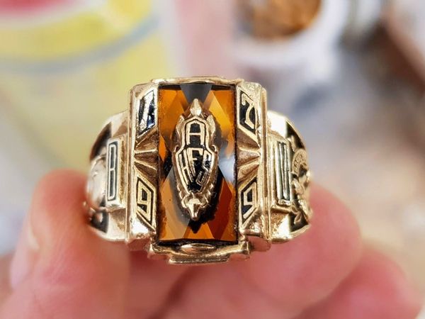 nhẫn mỹ hột vàng hổ phách 1979 Mặt nhẫn phorm vuông vàng đặc nguyên khối , chính giữa là hột vàng hổ phách có gắn logo mang tên trường AFHS(American Fork High School), thiết kế ổ...