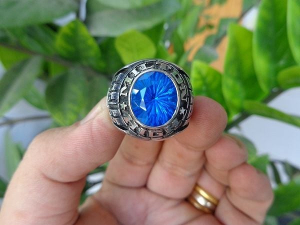 – Trên cùng là hột xanh dương biển màu Sapphire mặt giác đáy tia cực kỳ huyền thoại. Bao quanh hột là tên trường Milton High School.