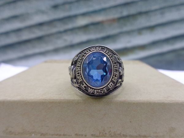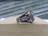 Nhẫn Mỹ Jostens ArgentusTrên cùng là hột màu xanh aquamarine với bề mặt và đáy mài đa giác sáng lấp lánh, bao quanh là tên trường Morristown-Hamblen High School West- Bên hông phải nhẫn là hình...