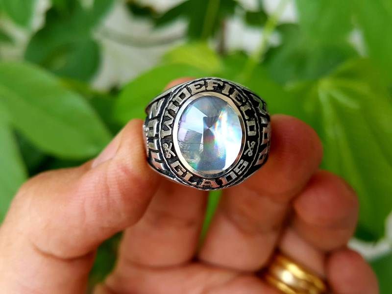 Trên cùng là hột đá màu trắng trơn bóng đáy phản quang 7 màu ra nắng cực độc rất long lanh như mắt mèo, bao quanh hột là tên trường WideField Glads High School.