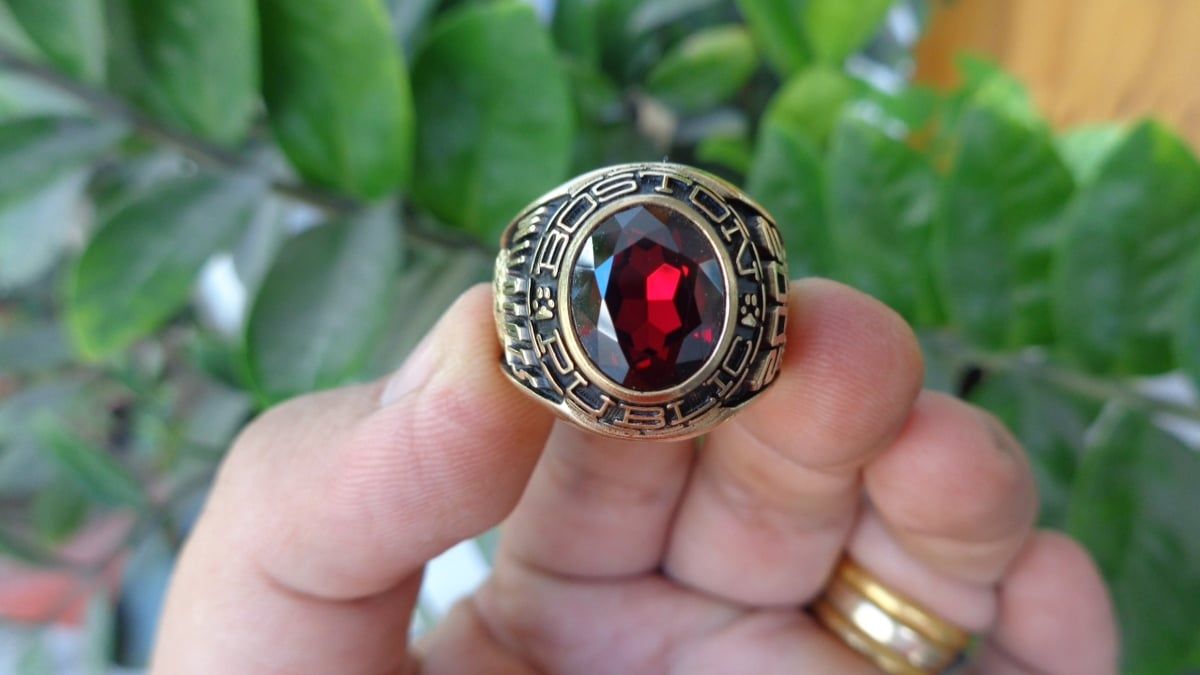 - Trên cùng là hột đỏ màu Ruby với bề mặt và đáy mài đa giác long lanh, bao quanh hột là tên trường Boston Public