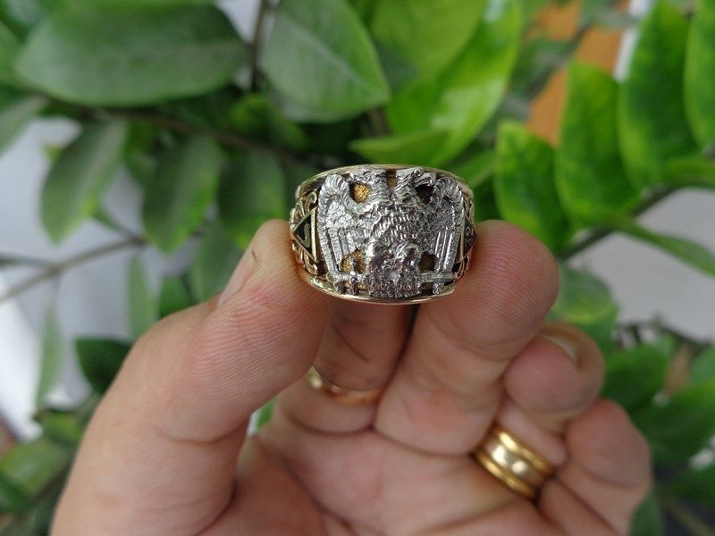– Trên cùng với mặt biểu tượng đặc trưng đại bàng đôi nét căng của dòng Masonic bằng vàng trắng 10k white gold Platium. phần thân nhẫn được làm bằng chất liệu vàng vàng 10k .