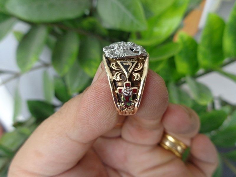 – bên hông trái nhẫn có khắc mặt men biểu tượng của dòng Masonic Angel với số 7 cách điệu huyền bí, men màu thập giá hoa hồng.