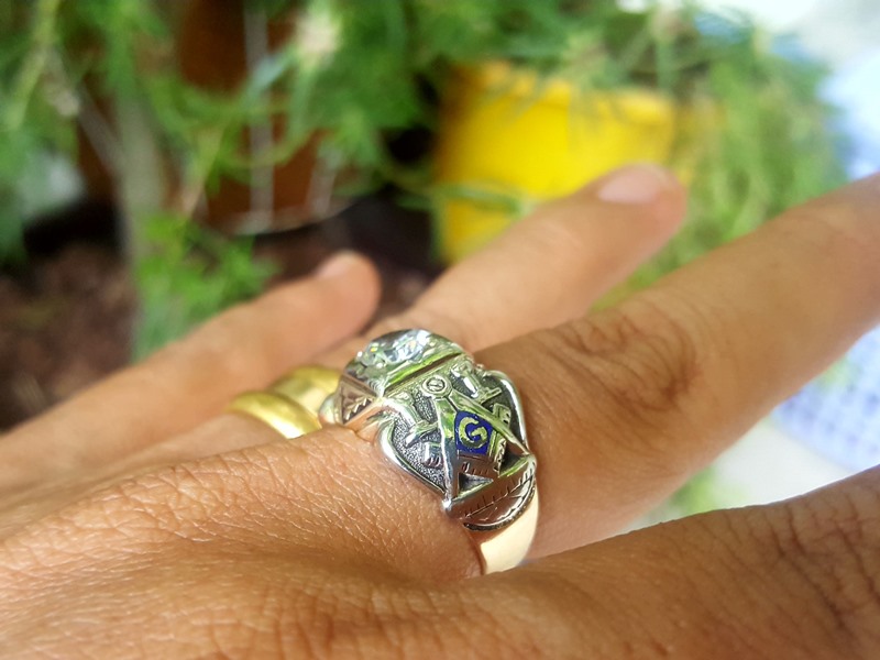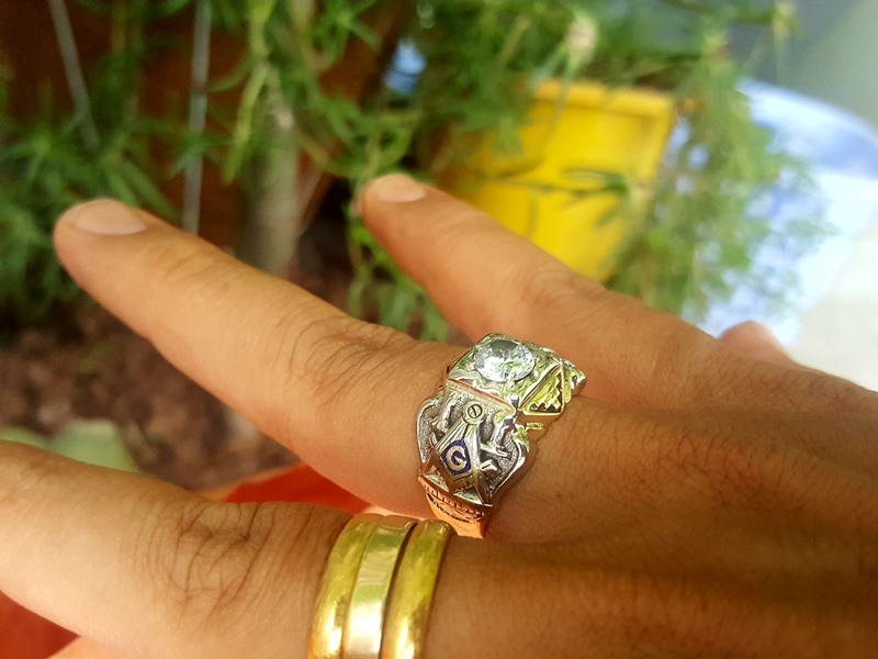 – Hai bên hông nhẫn là hình ảnh biểu tưởng chính của Masonic Freemasonry được khắc nổi với những đường nét chi tiết hoành tráng cùng lớp men màu tạo điểm khác biệt cho nhẫn. Hai bên hông có 2 cây cột trụ biểu tượng của đền thờ vua Salomom.