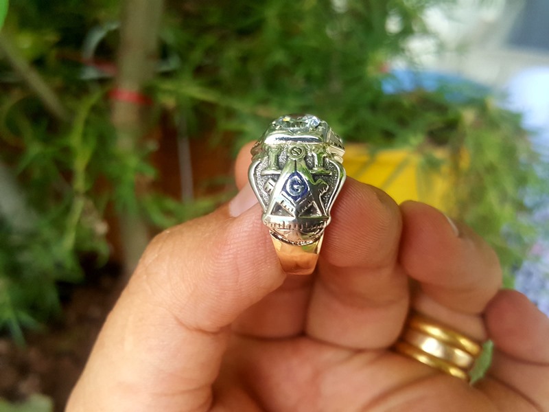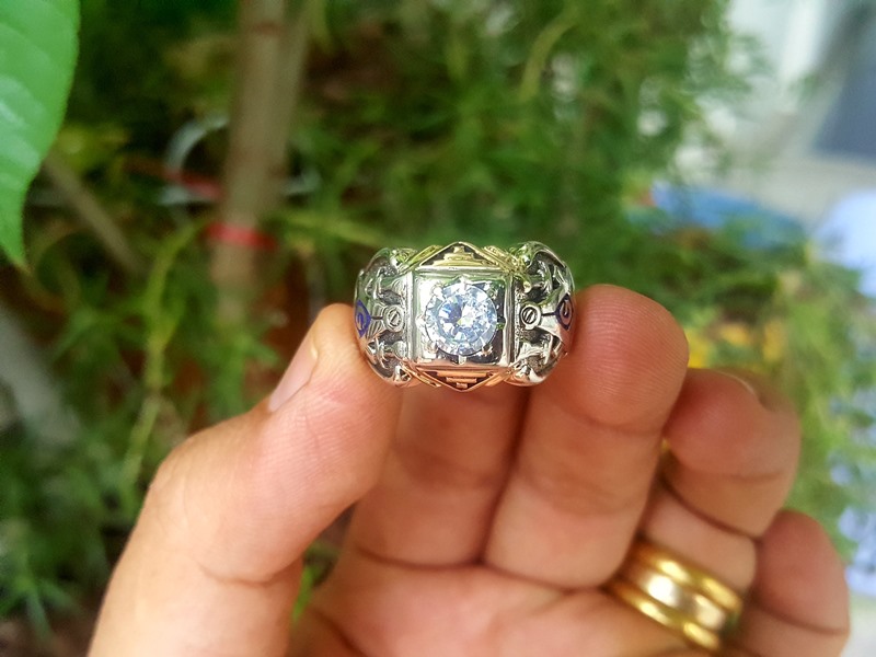 Nhẫn Mỹ Masonic Vàng 10K Xoàn 6ly3– Trên cùng là ổ vàng trắng chính giữa gắn viên kim cương nhân tạo Cubic Zincon ( CZ ) to 6.3 ly vật vã long lanh như bông...