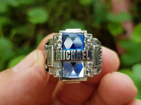 Trên cùng là hột vuông hai màu xanh biển và màu trắng với bề mặt mài đa giác lấp lánh đáy tráng thủy chính giữa hột khắc tên chủ sở hữu Michael, hai bên hông hột có đính 8 viên xoàn CZ vuông làm tăng độ lấp lánh khi ra nắng.