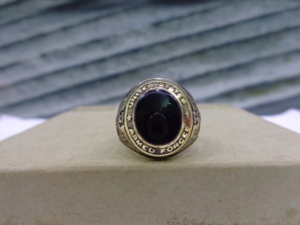 Nhẫn Mỹ Quân Đội 10k Armed ForcesTrên cùng là hột đá blackoxy trơn bóng, bao quanh hột là dòng chữ United States Armed Forces (lực lượng vũ trang Hoa Kỳ), thiết kế nhẫn dạng phrom...