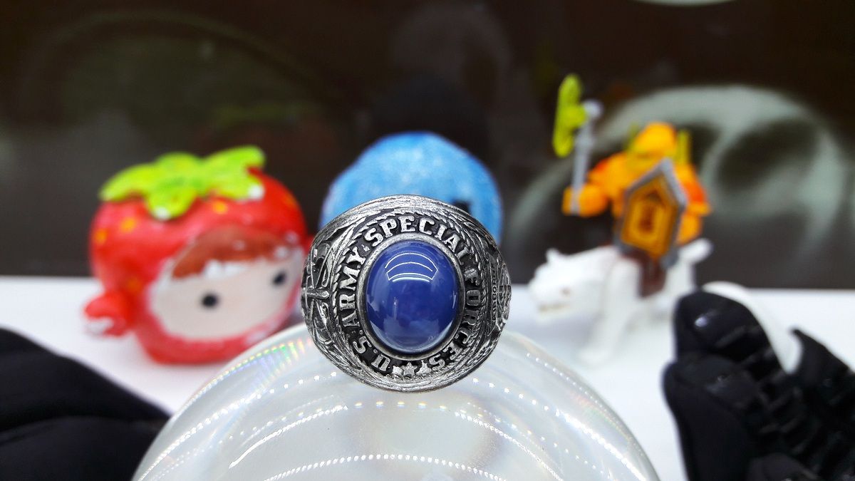 Trên cùng là hột Saphire Sao màu xanh biển , hàng hiếm, rực sáng sao 6 vạnh khi ra nắng . bao quanh hột là dòng chữ U.S Army Special Forces.( Lực lượng đặc biệt tham chiến tại chiến trường Việt Nam )